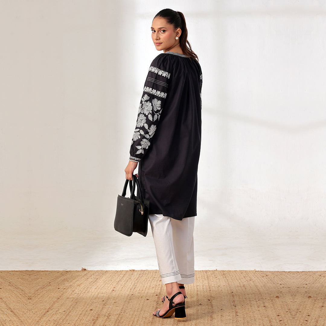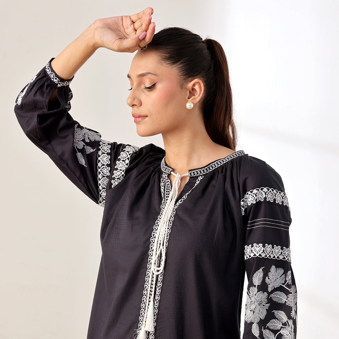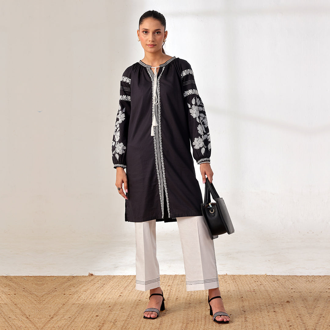 The outfit features the Black kurta with white embroidery along the neckline & sleeves paired with white pants which have coordinating stitches on hem & side seam.