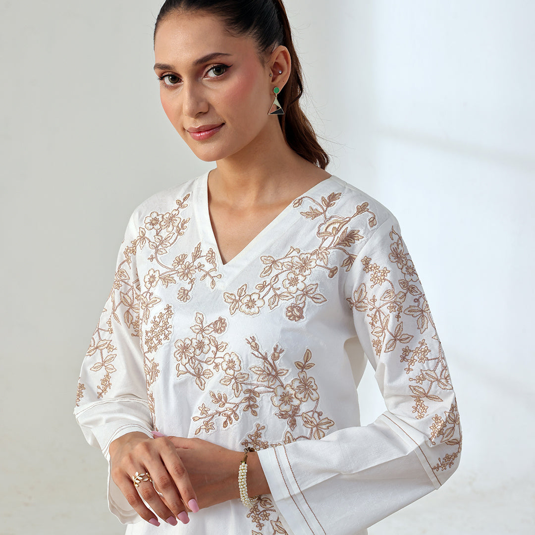 A dove color 2pcs co-ordset featuring a short embroidered shirt with varying shades of beige complemented by matching pants.