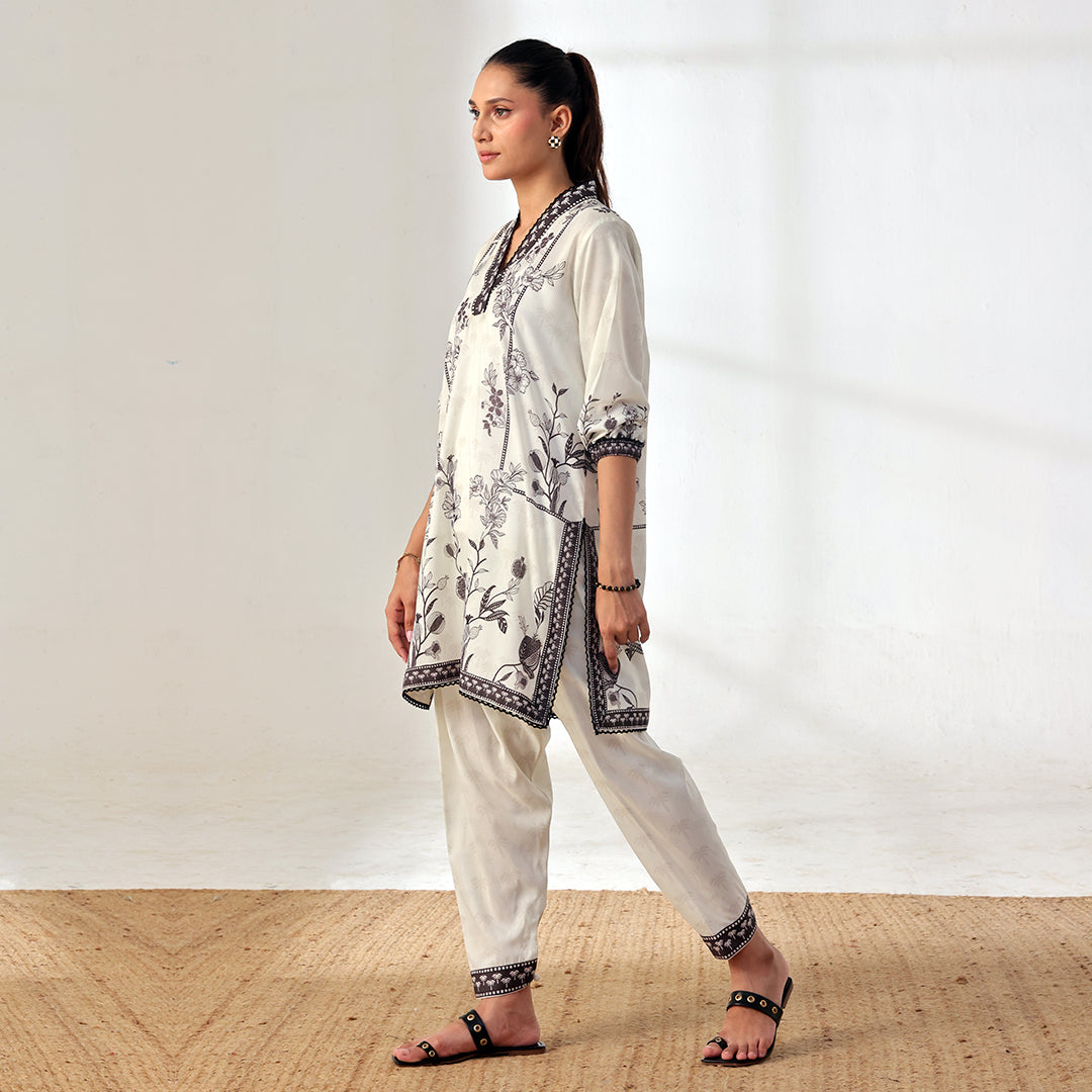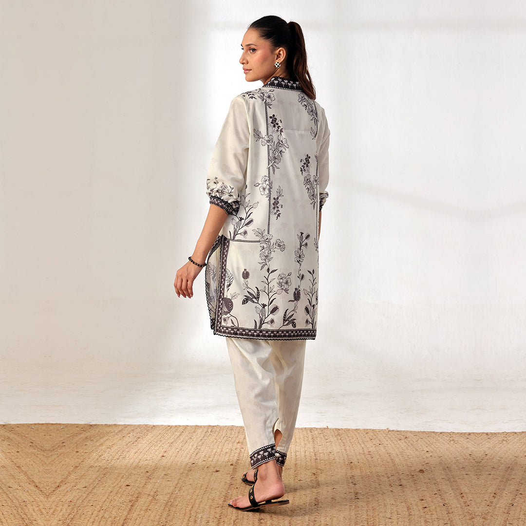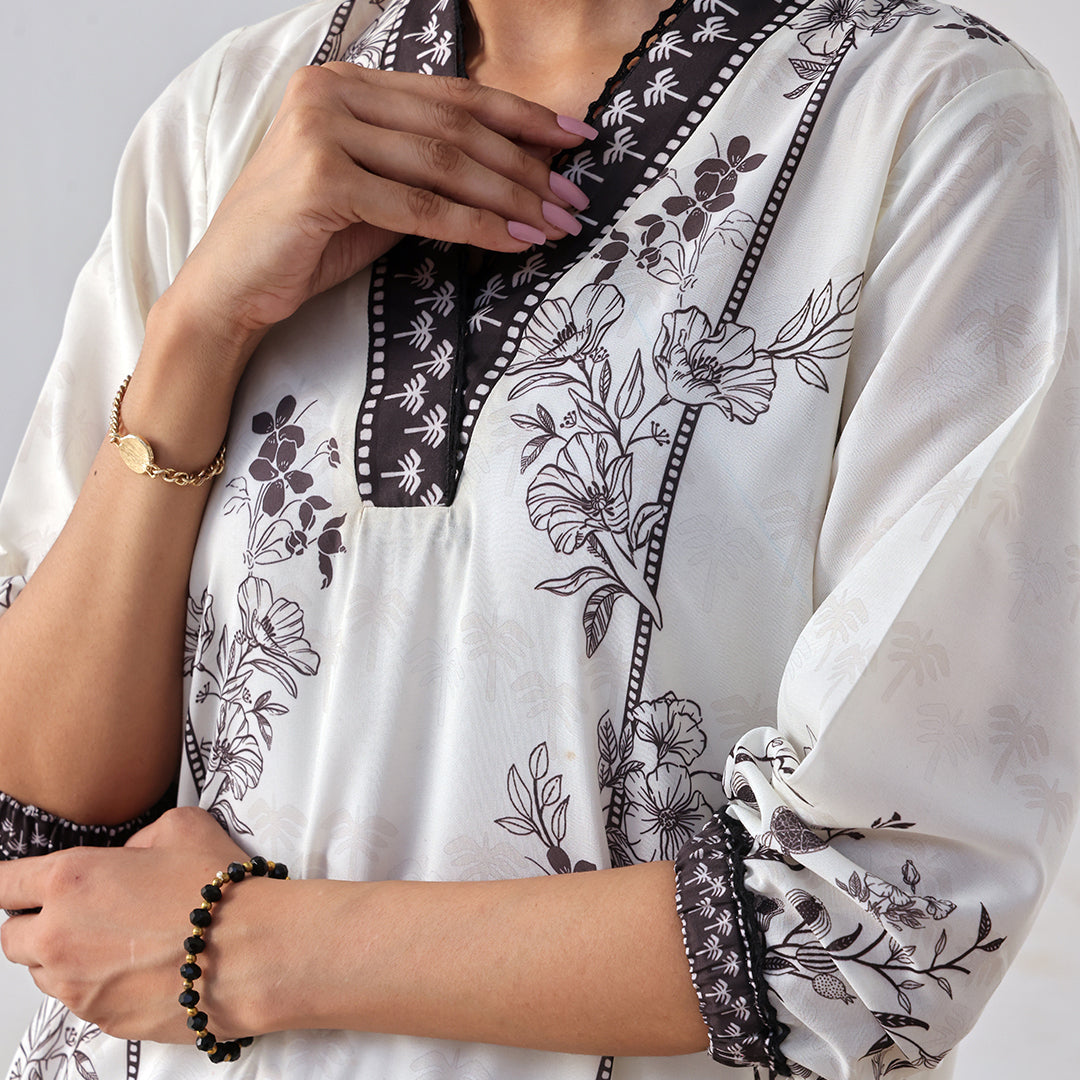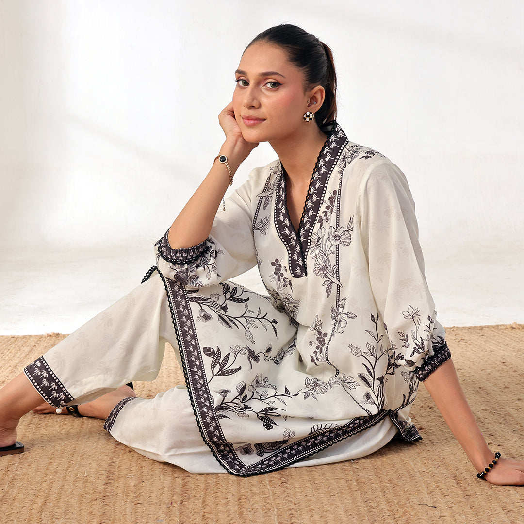 This mono muse matching set features a Top with floral prints cascading along the neckline and sleeves, while subtle lace accents enhance its charm. Paired with tailored, pleated shalwar that echo the intricate details of the top.