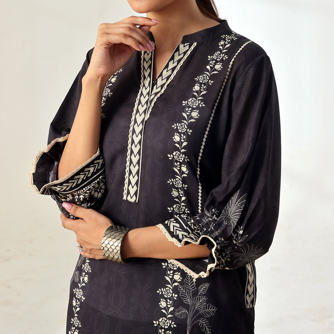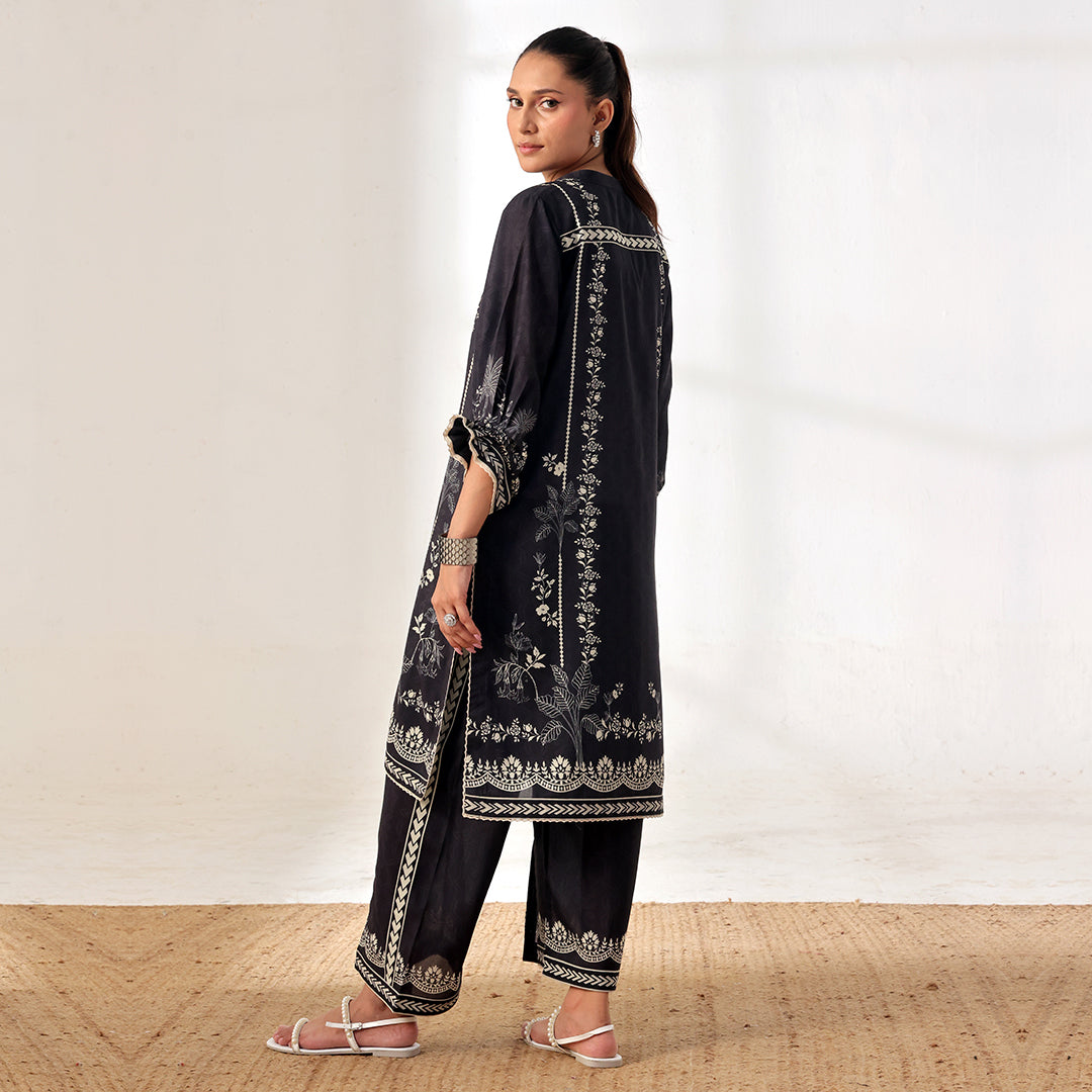 This mono muse black matching set is adorned with intricate prints. The shirt features delicate lace-trimmed edges and functional pockets, adding both elegance and practicality. Paired with tailored pants that mirror the shirt intricate detailing.