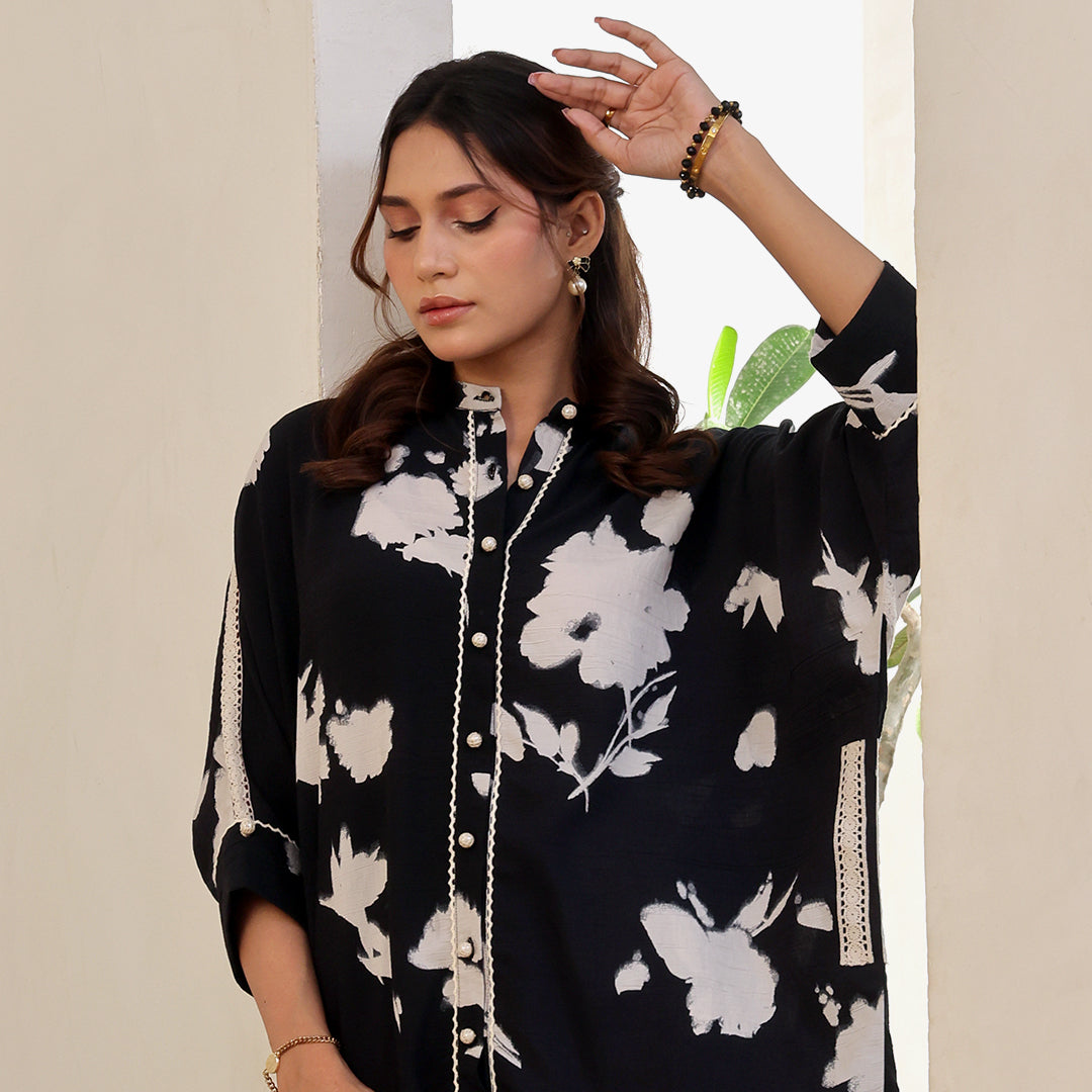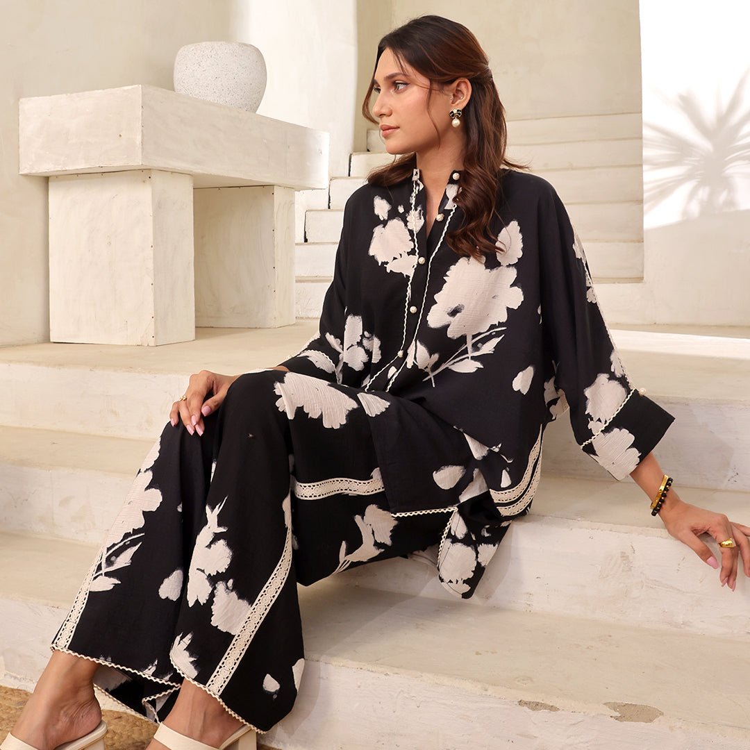 Printed Co-Ord Suit featuring crochet lace detailing.