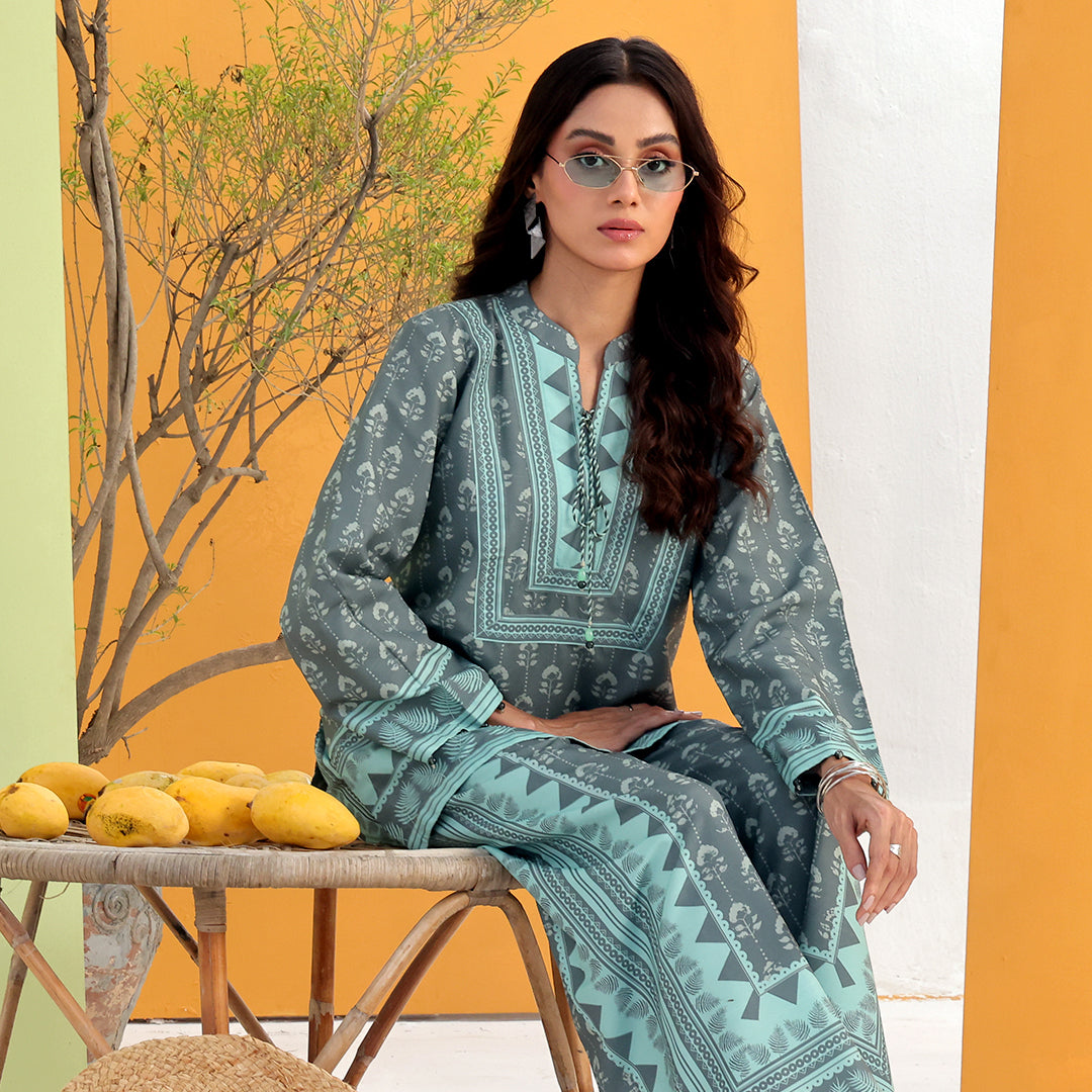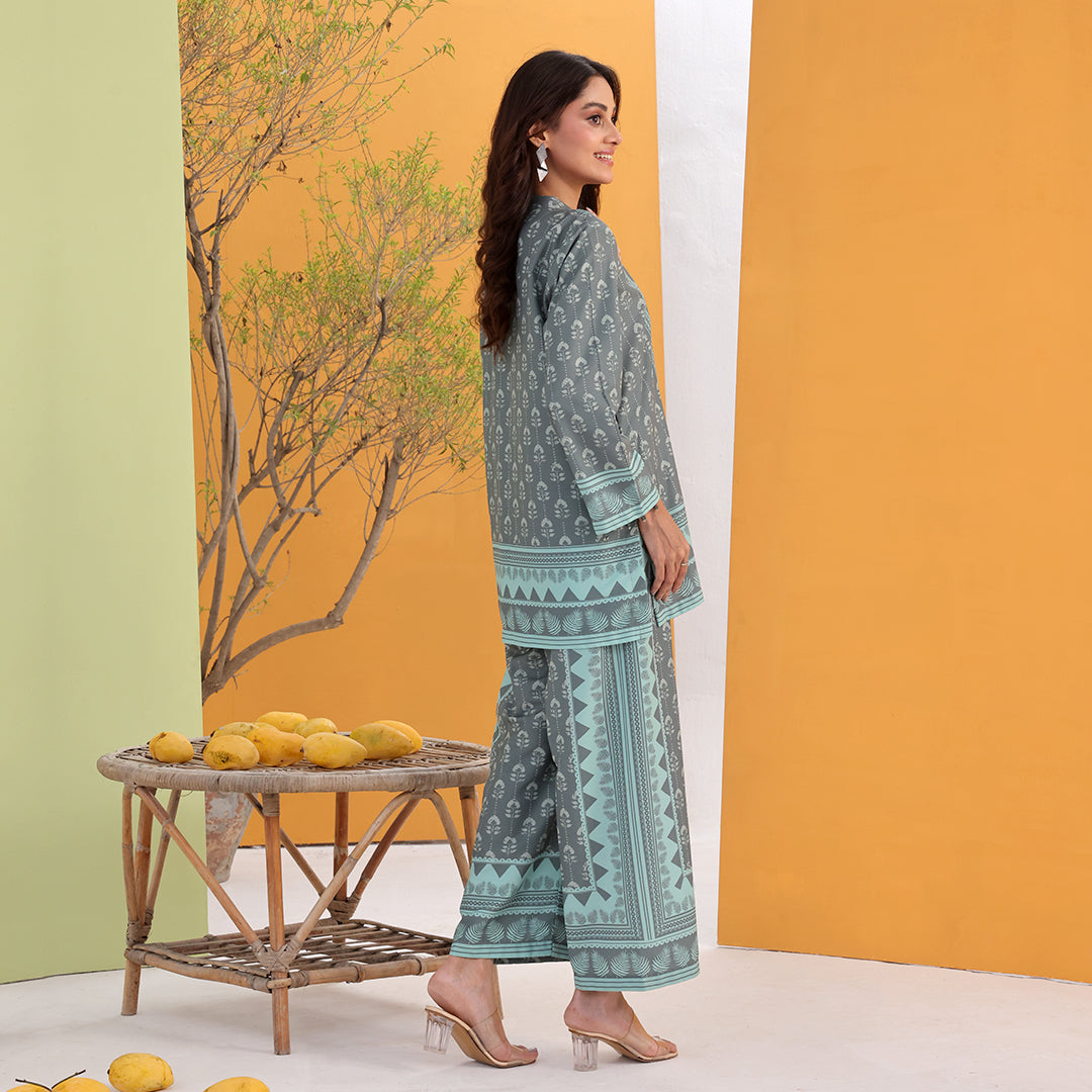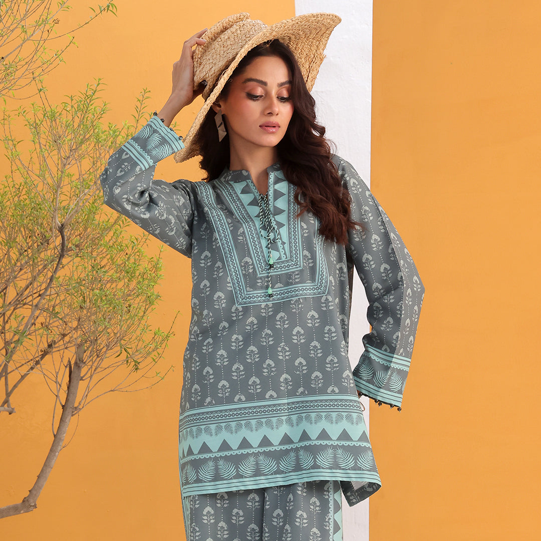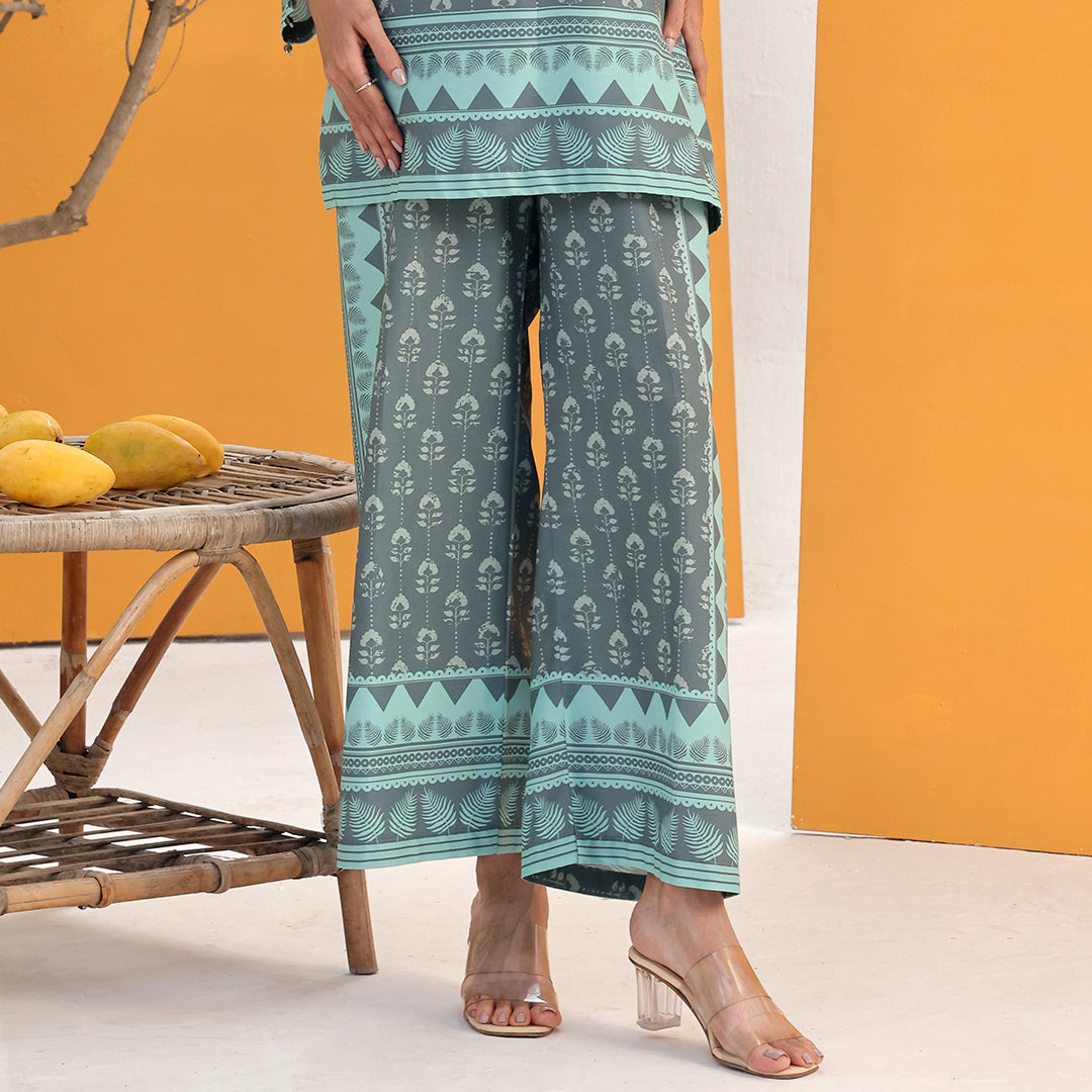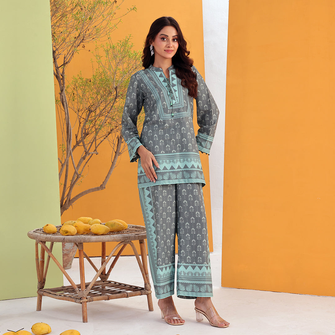 Live in Light Teal Ethinic print Cord set features in grey base color with hand detailing paired with matching pants.