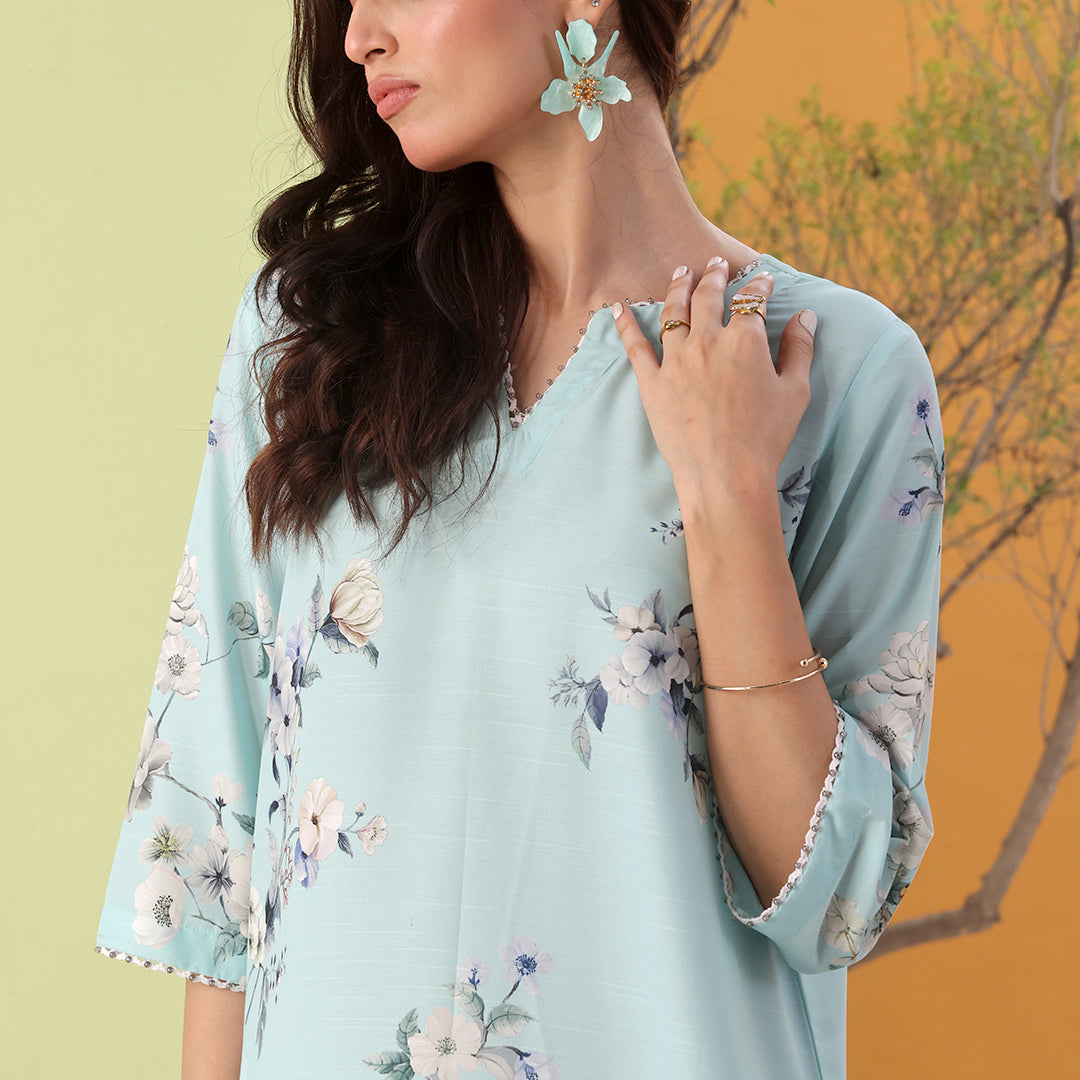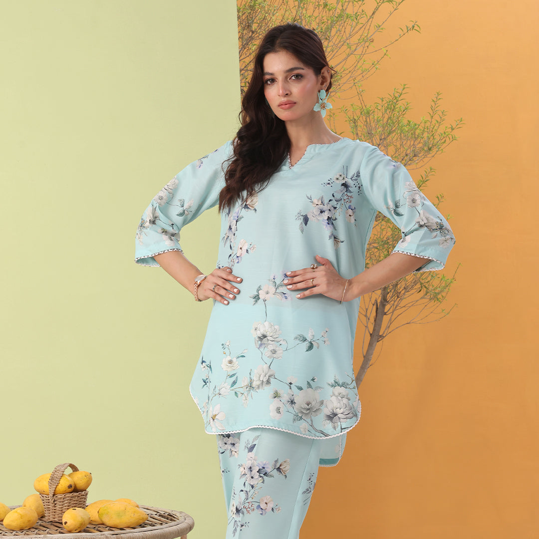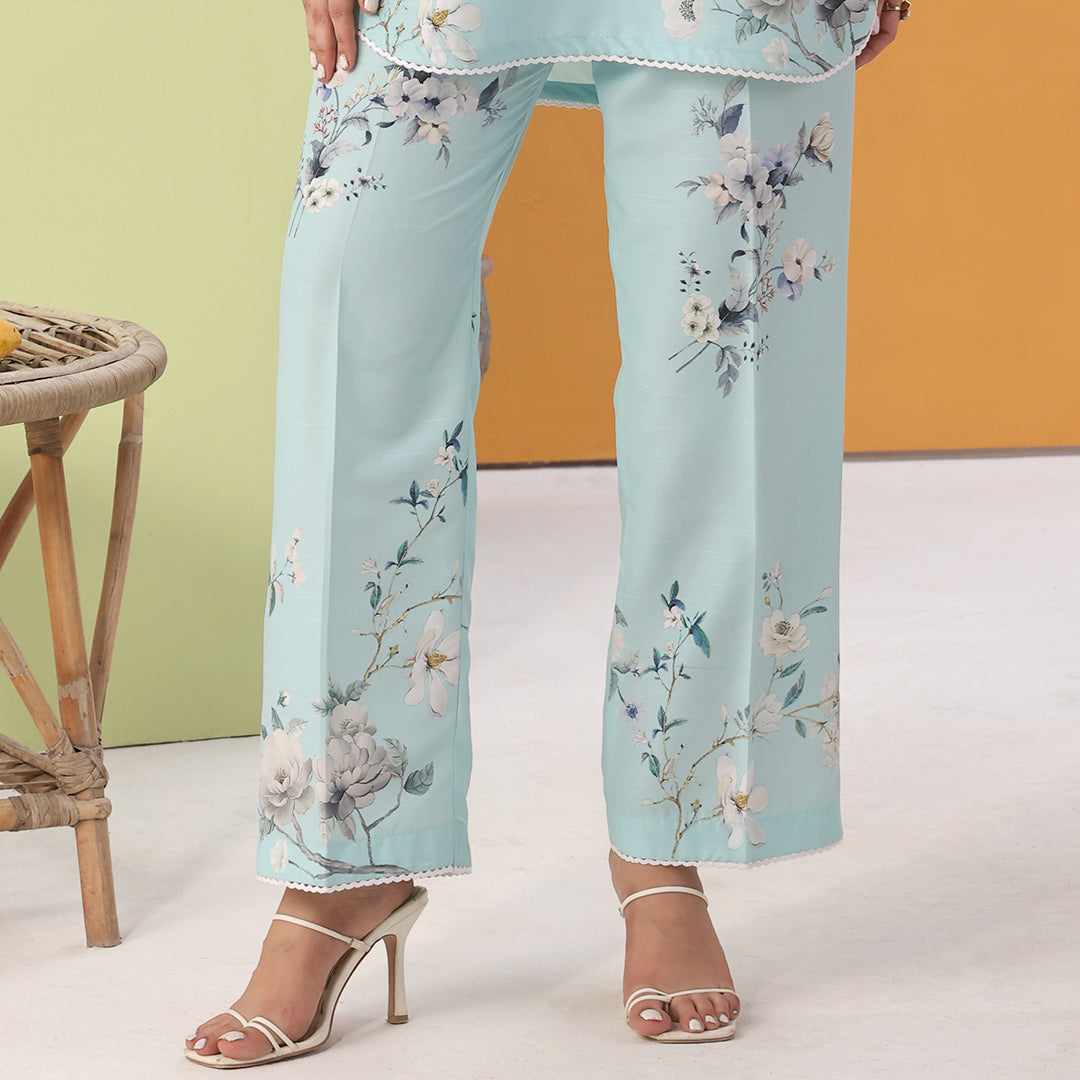 The Ice Blue Floral Print Cord Set with Crochet Lace detailing.