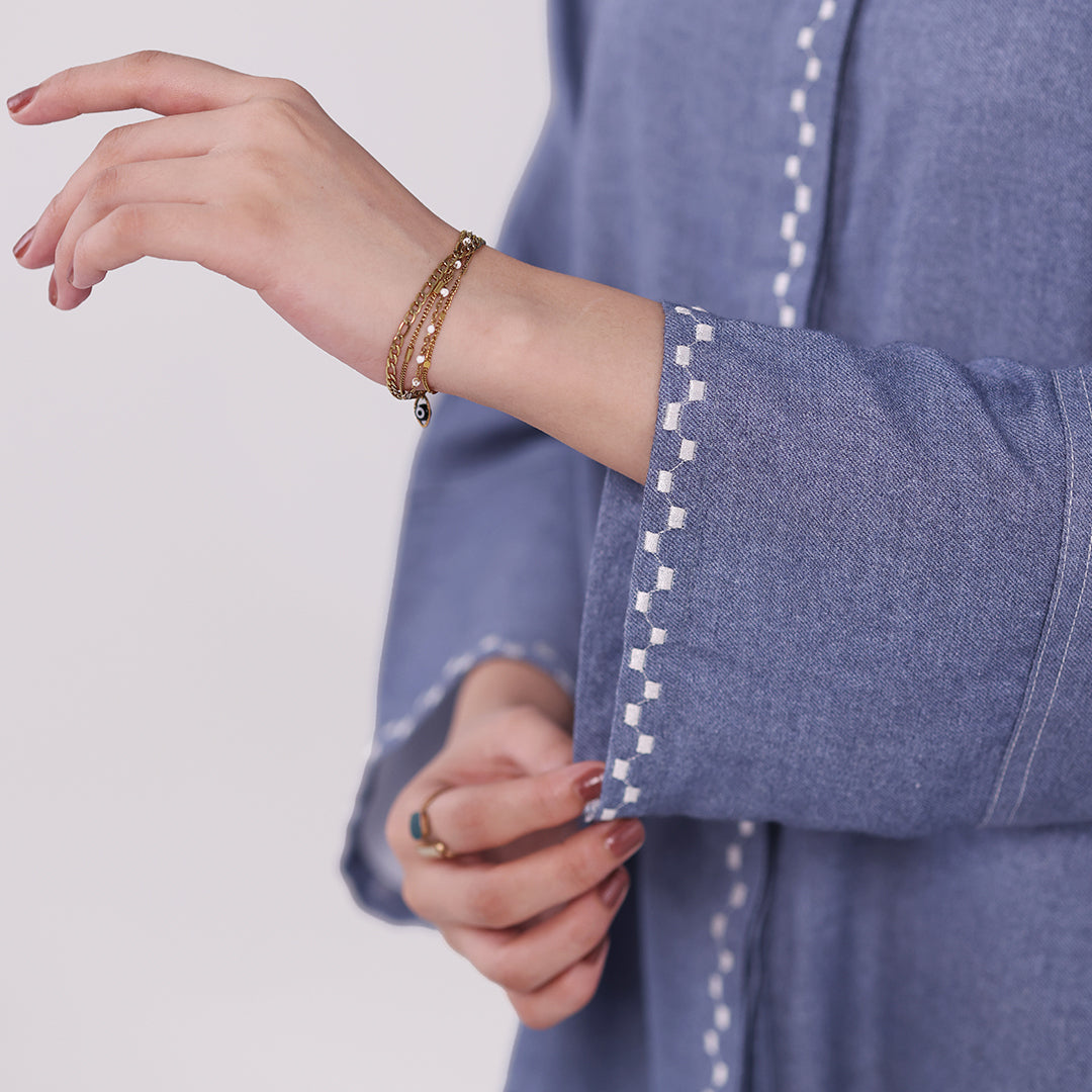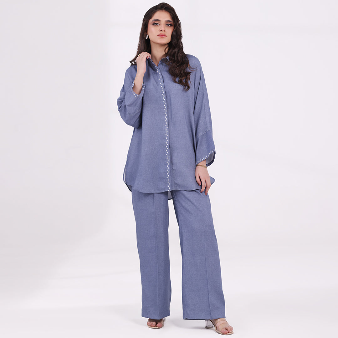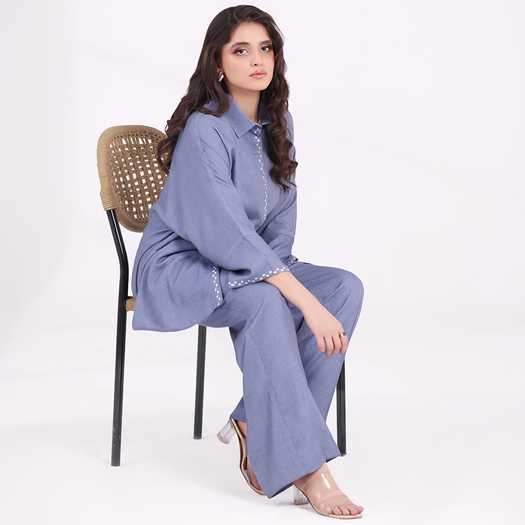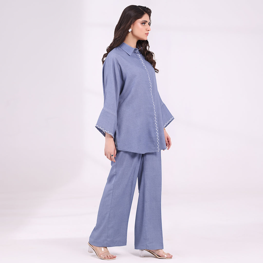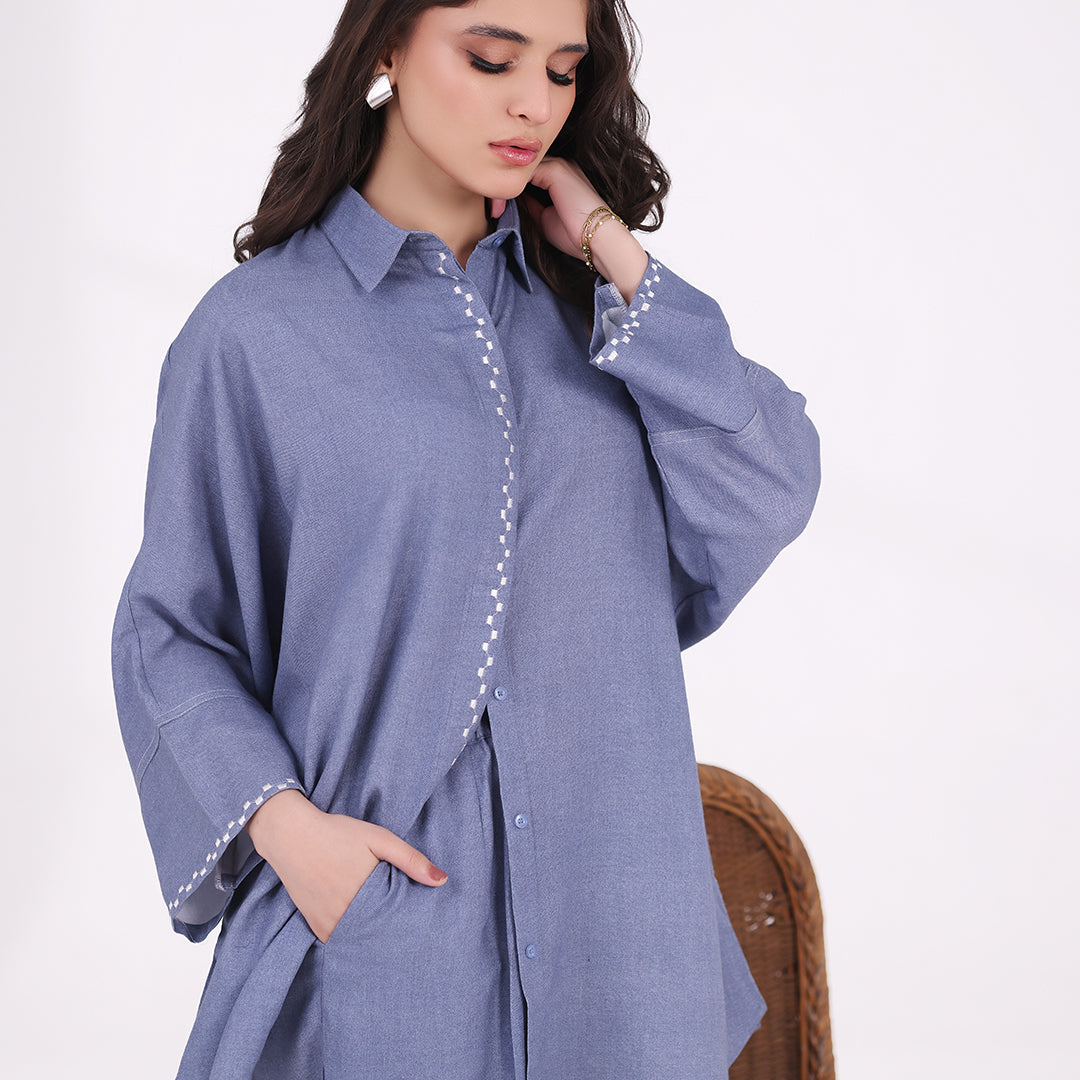 Denim–linen blend shirt with a collared neck and front button-through opening featuring an embroidered placket. Includes 3/4 wide sleeves. Paired with pull-on linen trousers with side pockets.