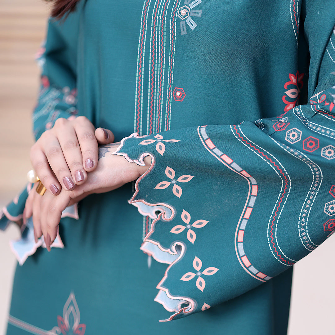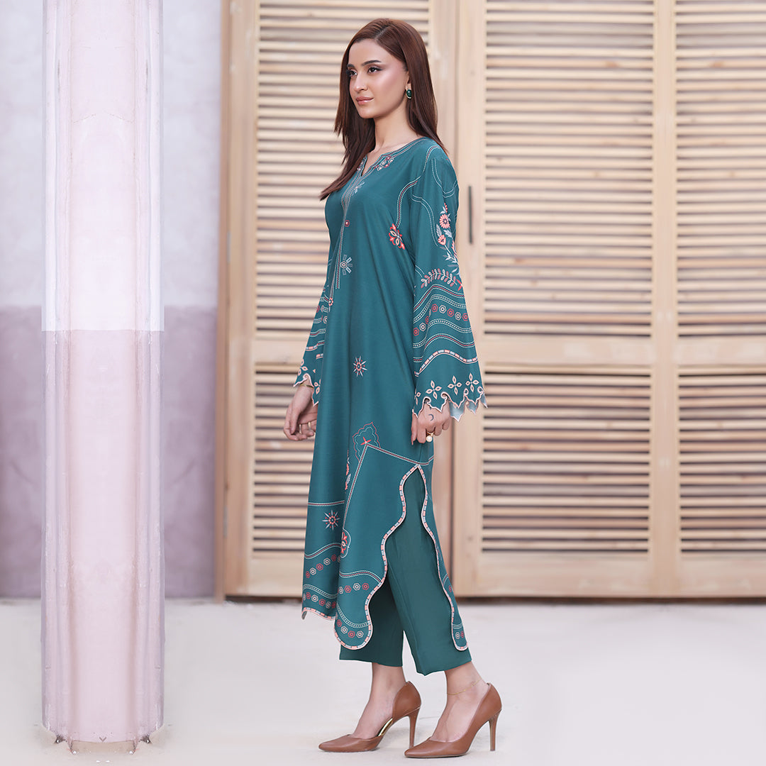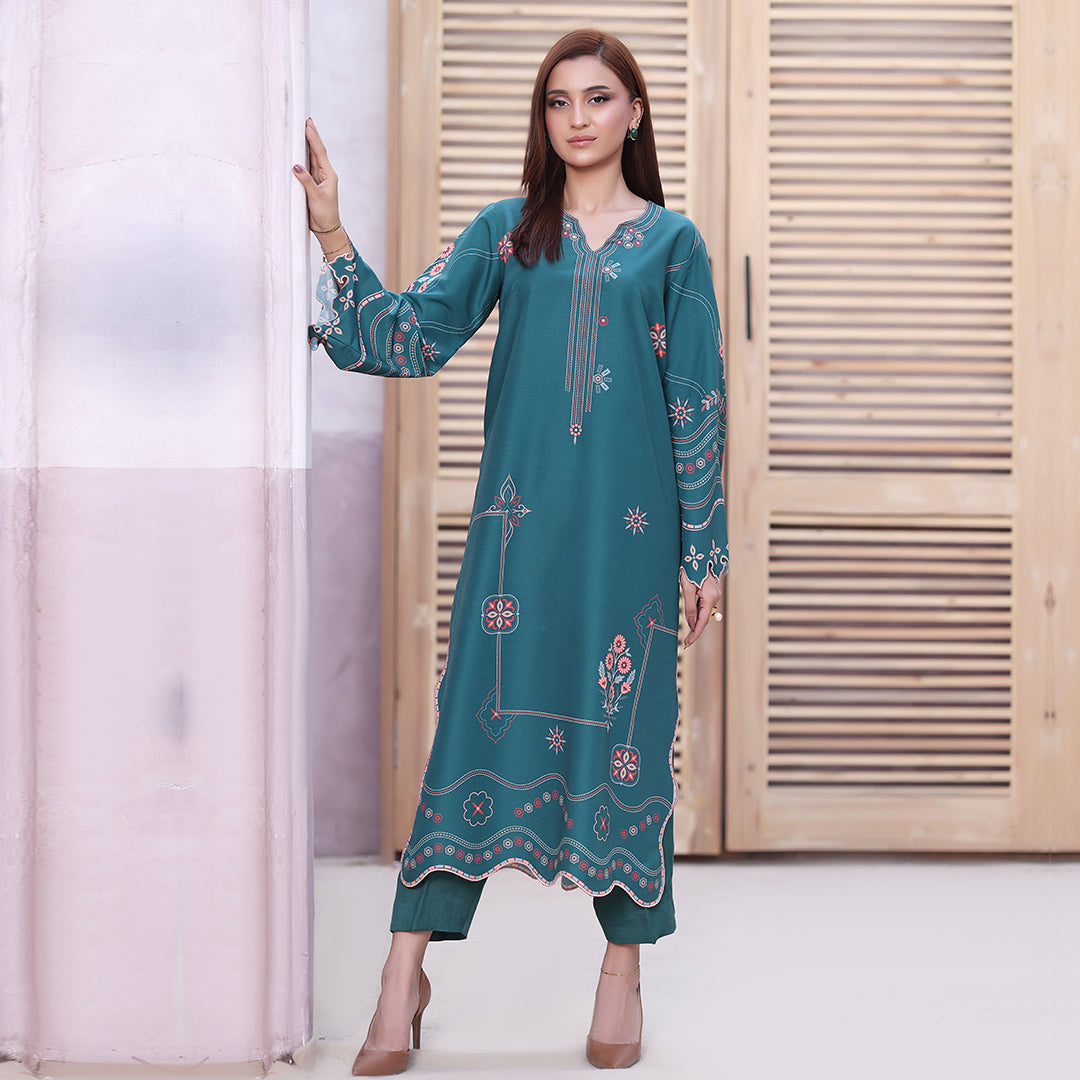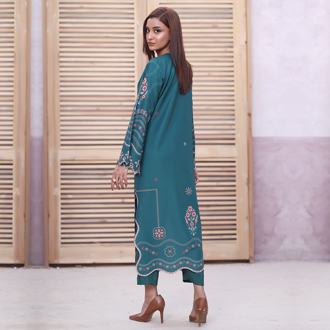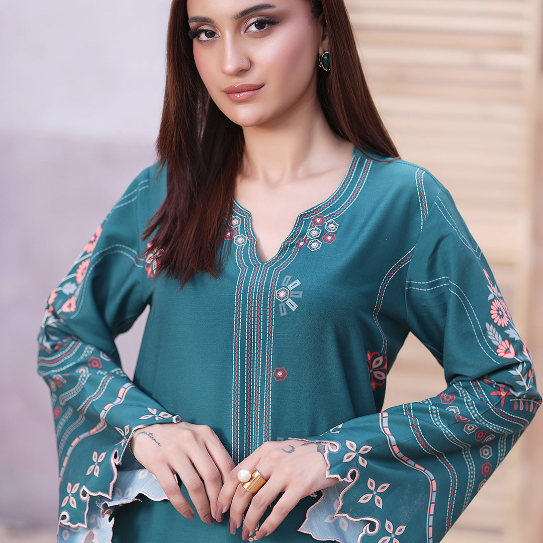 An Emerald long kurta adorned with all-over geometric and floral embroidery print Motifs. Paired with plain culottes enhanced with scalloped detailing, this ensemble blends elegance with intricate craftsmanship.