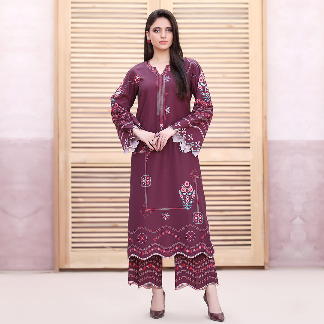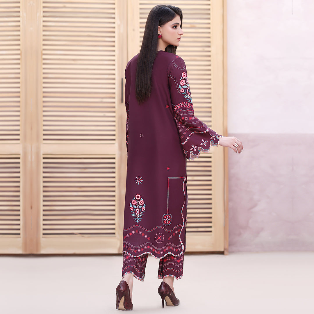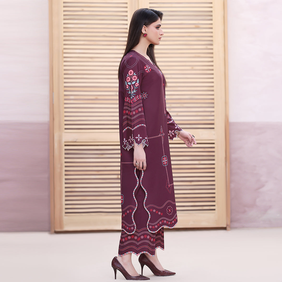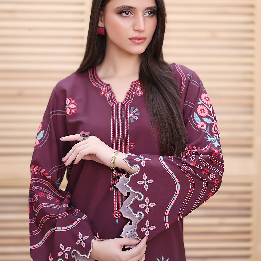 A Ruby long kurta adorned with all-over geometric and floral embroidery print Motifs. Paired with plain culottes enhanced with scalloped detailing, this ensemble blends elegance with intricate craftsmanship.